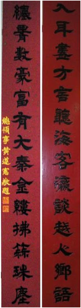 最珍贵的当然是最后这对由新加坡清朝第一任总领事时所题写的楹联,用的是其所擅长的隶书。这对楹联原来是放在天后宫的柱子上,后来移到会馆的大厅里。黄遵宪是广东客家梅县人,1891年到1894年出任清朝驻新加坡的第一任总领事。当时华人移民大多来自中国福建、广东各省,不懂普通话,所以有“入耳尽方言,听海客瀛谈,越人乡语”之说。“大秦”与“拂箖”都是指东罗马帝国;只不过在汉、魏、晋时代,称之为“大秦”;而到唐、宋时则称“拂箖”。